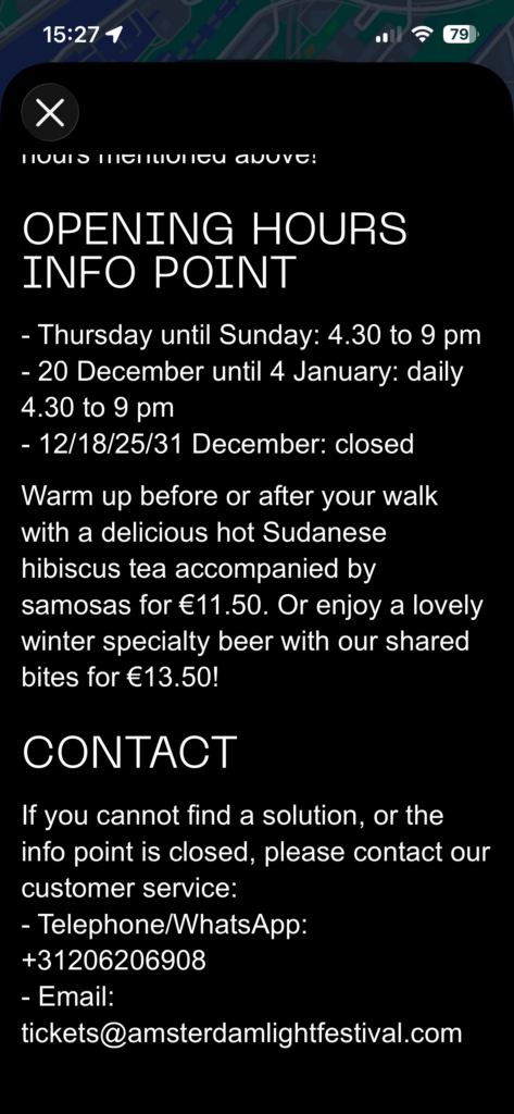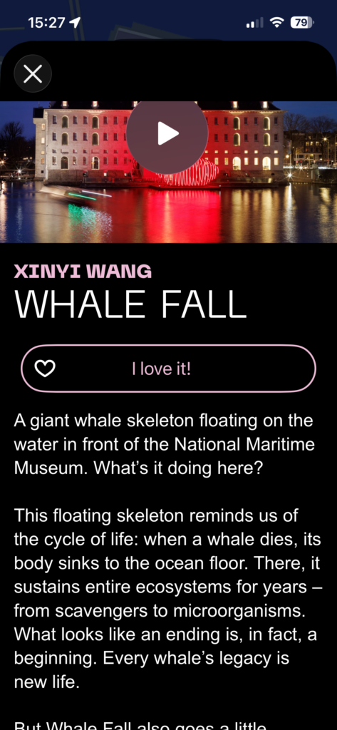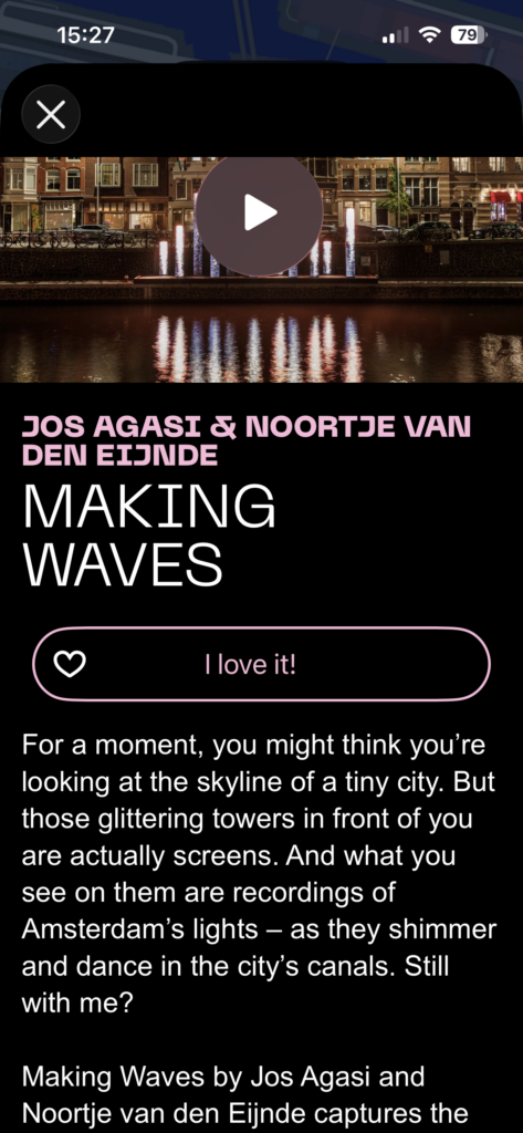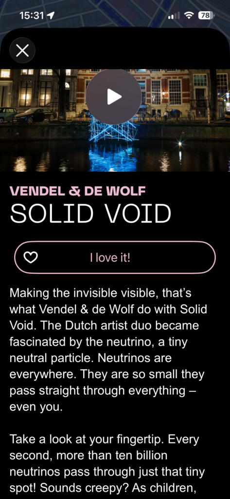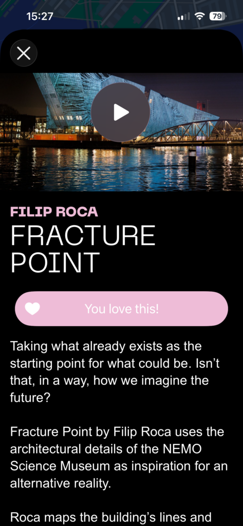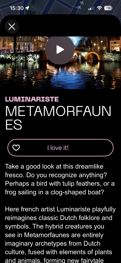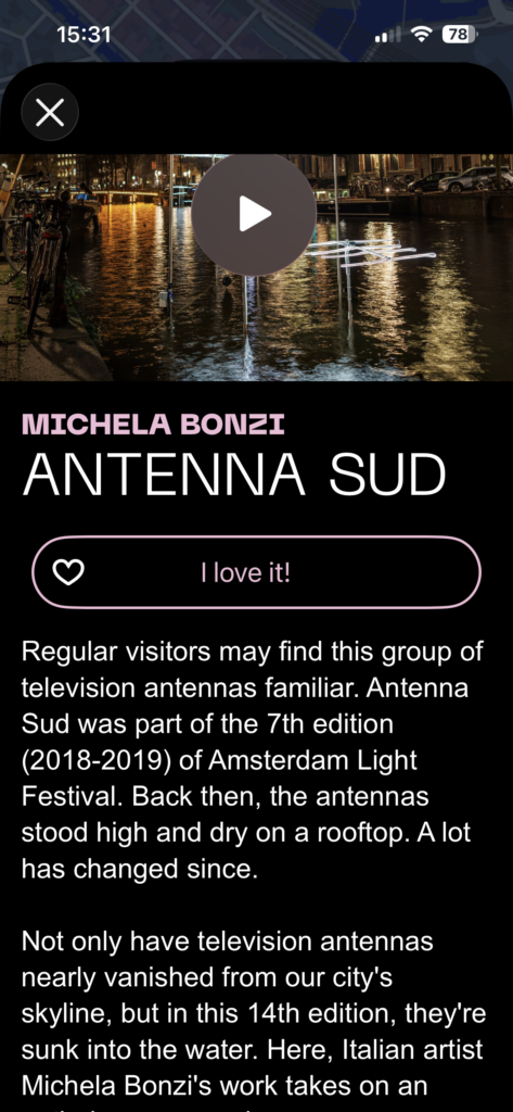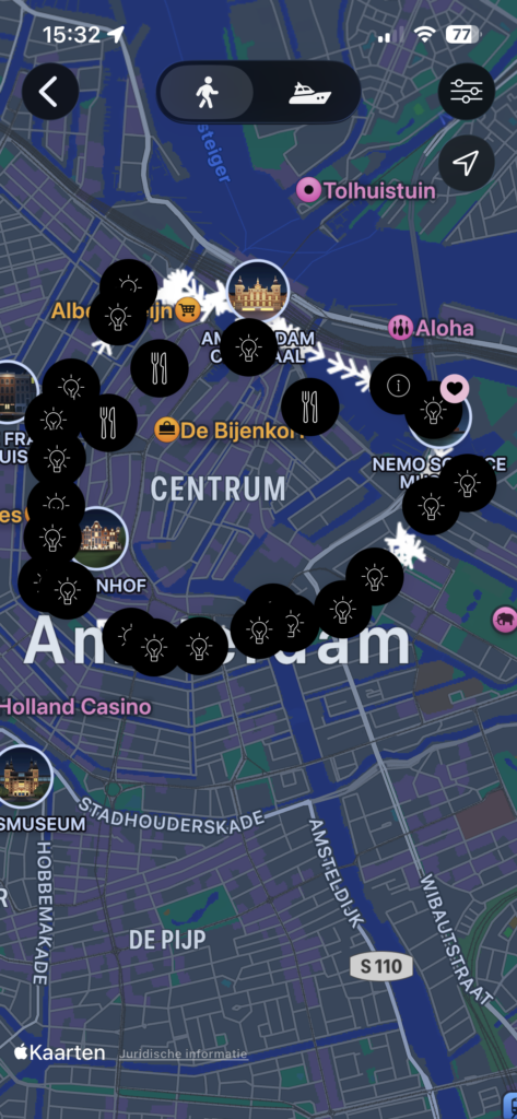 Let op: eerst naar het poort-icoontje (OBA, steiger voor de openbare bibliotheek) lopen. De vaarrichting is tegen de richting van de klok in!